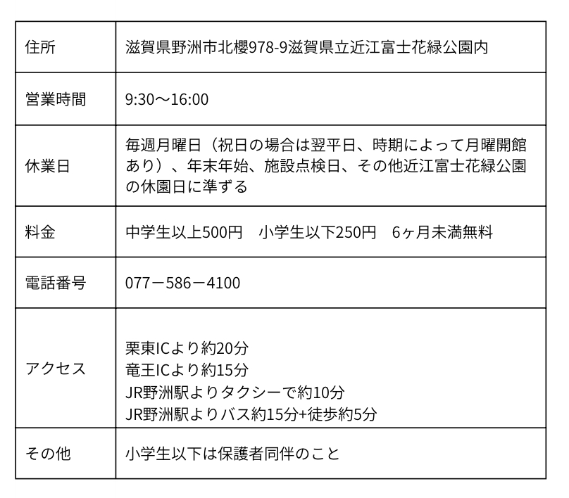 JR野洲駅よりバス約15分+徒歩約5分